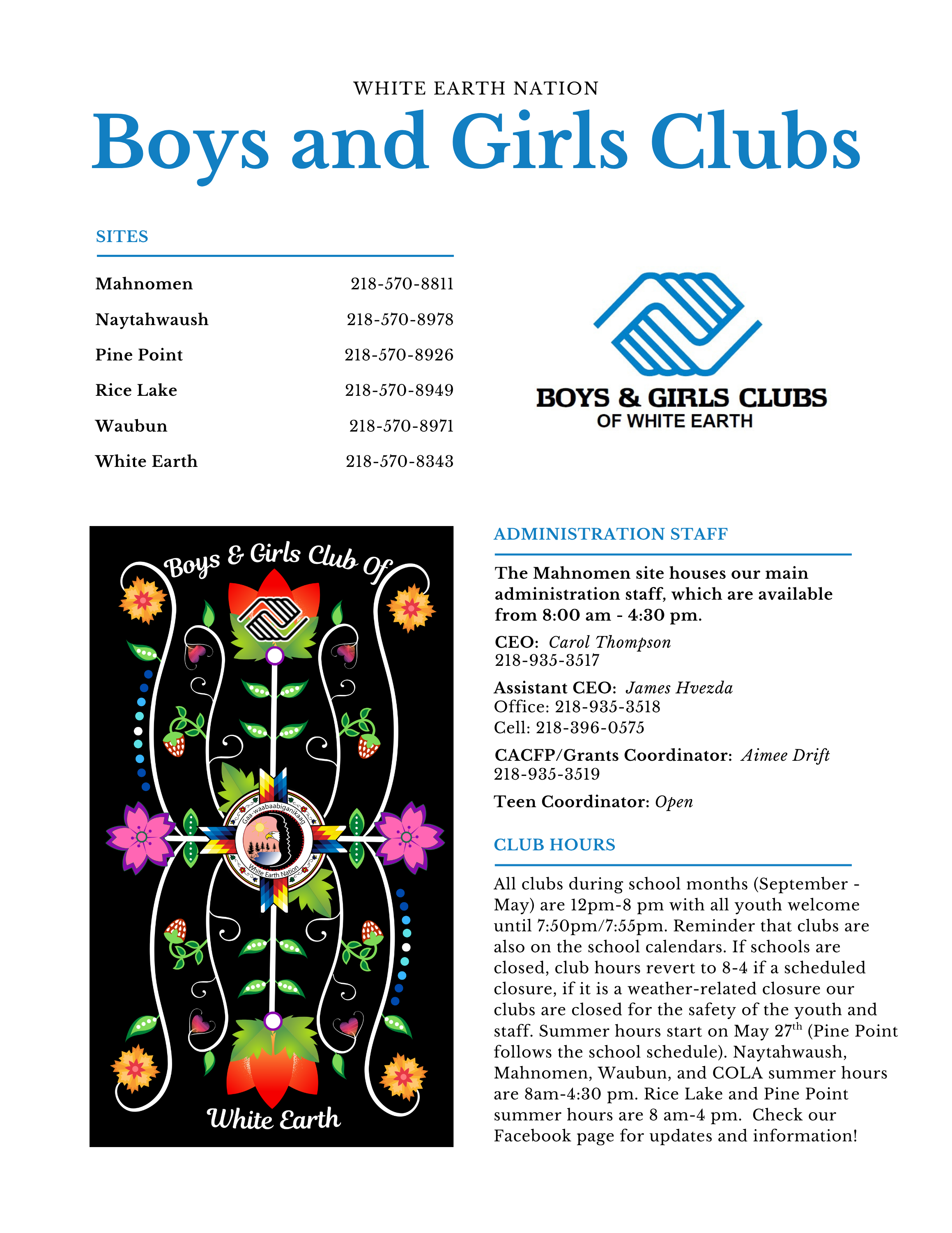 White Earth Boys & Girls Clubs serves youth ages 5-18 during after-school and summer hours. We currently offer services in Rice Lake, Naytahwaush, Waubun, Mahnomen, White Earth, and Pine Point.